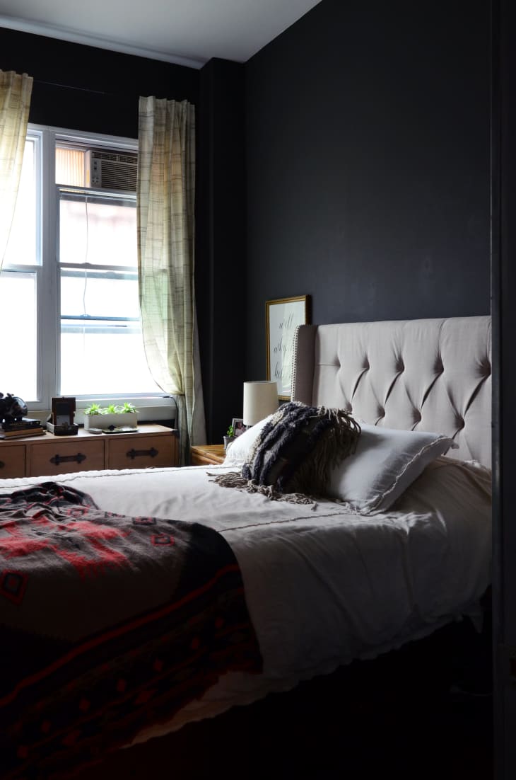No budget for built-ins in your bedroom? No problem. Clean-lined black bookcases seamlessly blend into the Benjamin Moore Onyx-colored walls in Angie Teater’s New York City studio, where the shelving unit looks as if it had been there all along. Black furniture paired with black walls can give you that custom look, and the whole apartment still feels light and bright because of all the natural light pouring in through that large window.