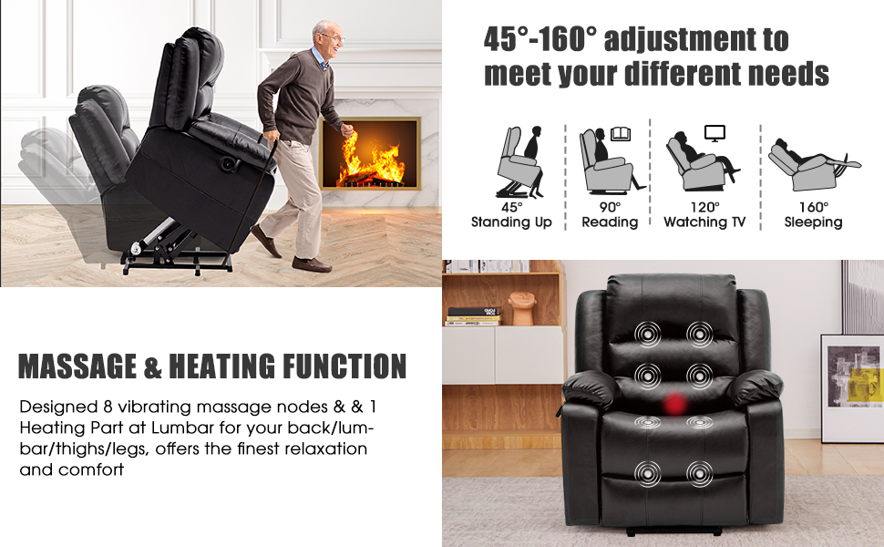 【Power Lift Assistance】 – Our powerful and UL approved silent lift motor, have better performance, the more quiet operation, longer service lifespan.Our lift chair can pushes the entire chair up to help the senior stand up easily without adding stress to back or knees. Our lift recliner chair reclines up to 160 degrees,smoothly adjust to lift or reclining position you prefer by pressing two buttons on the remote control, which is easy to operate for people of all ages.